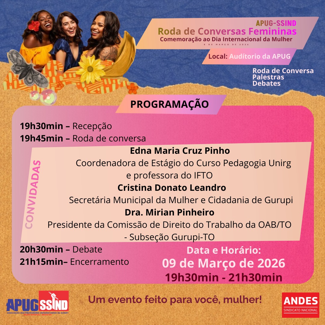 Em alusão ao Dia Internacional da Mulher, celebrado mundialmente em 8 de março, a Associação dos Professores Universitários de Gurupi – ApugSsind realizará, no próximo dia 09 de março, segunda-feira, das 19h30 às 21h30, no auditório Laudete Aires Pereira, na sede da entidade, a Roda de Conversas Femininas, reunindo mulheres docentes da Universidade e convidadas, para um momento de diálogo, reflexão, valorização e celebração.