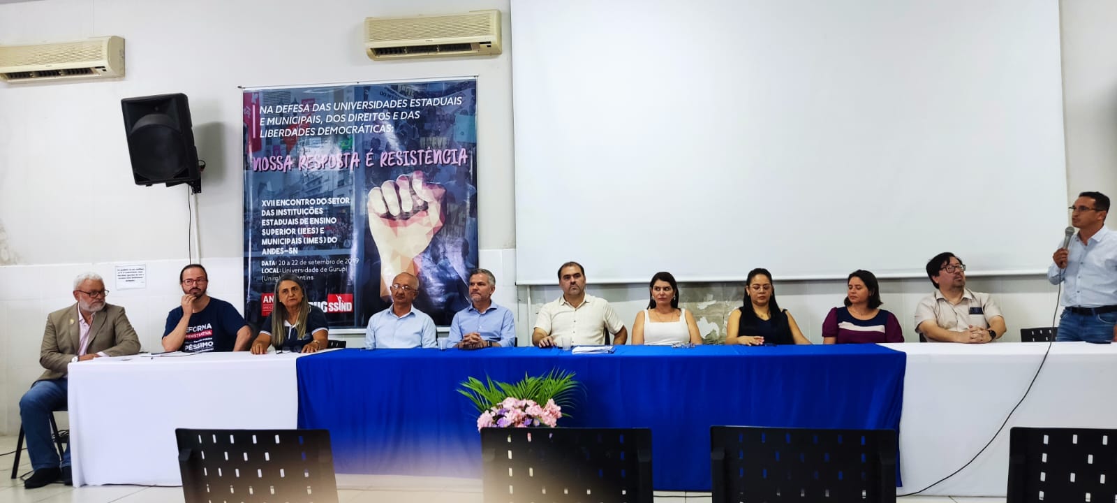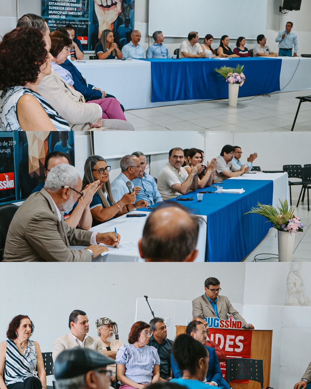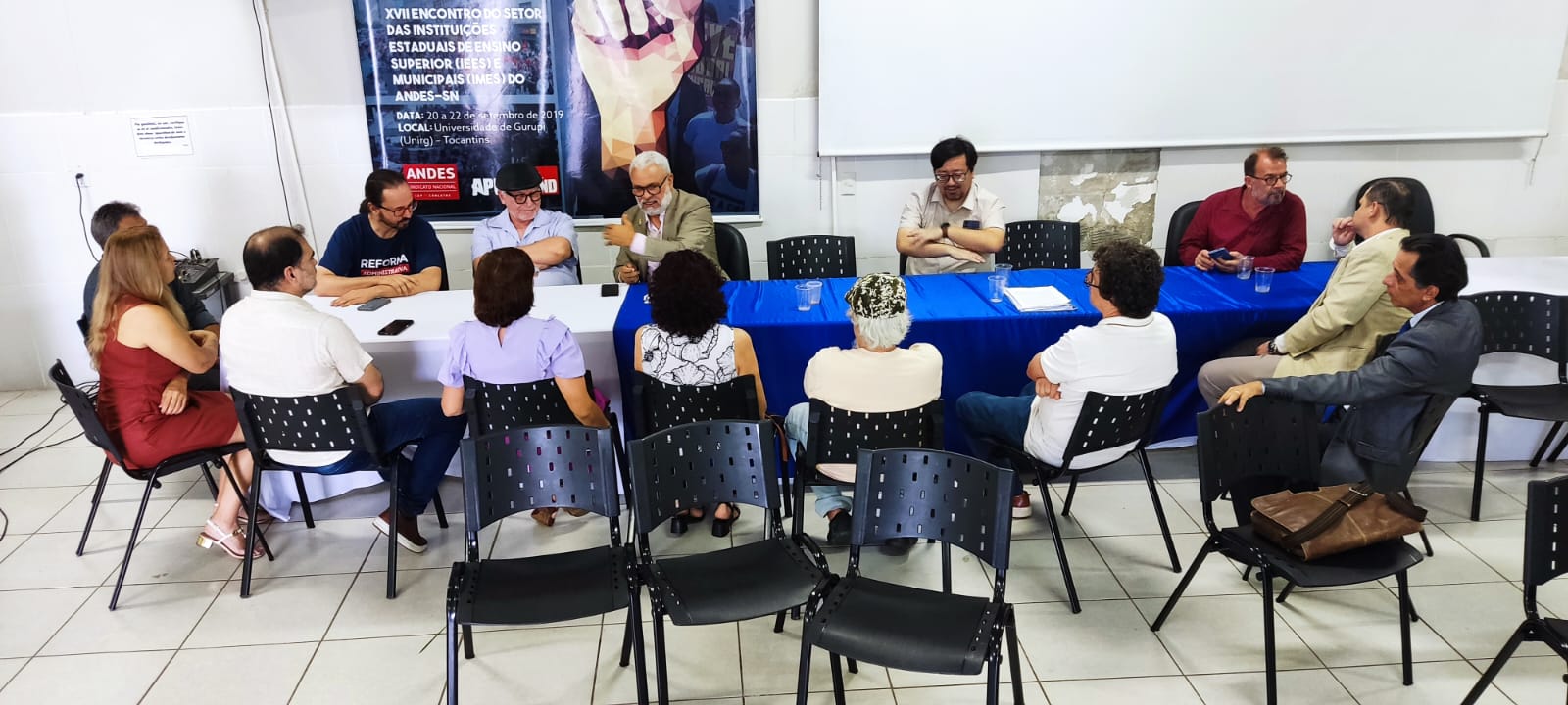 Durante a solenidade, compuseram a mesa representantes institucionais e de entidades sindicais parceiras que prestigiaram o momento de transição da gestão. Estiveram presentes a reitora da Universidade UnirG, professora Dr. Jaqueline de Kássia Ribeiro de Paiva; a presidente do SISEMG, Lucileia Barbosa do Nascimento; a representante do SINTET – Regional Gurupi, professora Vanda Paes França; o representante da SESDUFT – Seção Sindical dos Docentes da UFT, professor Fabiano Kenji Nohama; o presidente da ASAUNIRG, vereador Walter Coelho; além do professor Márcio Bernardes de Carvalho, que participou representando a Diretoria Nacional do ANDES-SN pela Regional Planalto. O presidente da Fundação UnirG Thiago Miranda foi representado pela Diretora Financeira Maria Adriana. Também estiveram presentes o Vice- Prefeito de Gurupi Adailton Fonseca e o Secretário de Governo Zezinho da Lá fiche, representando a Prefeita Josi Nunes.