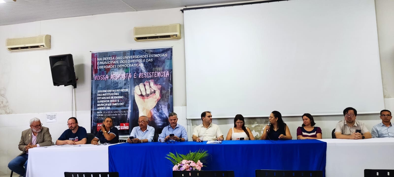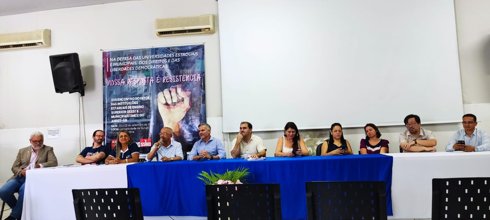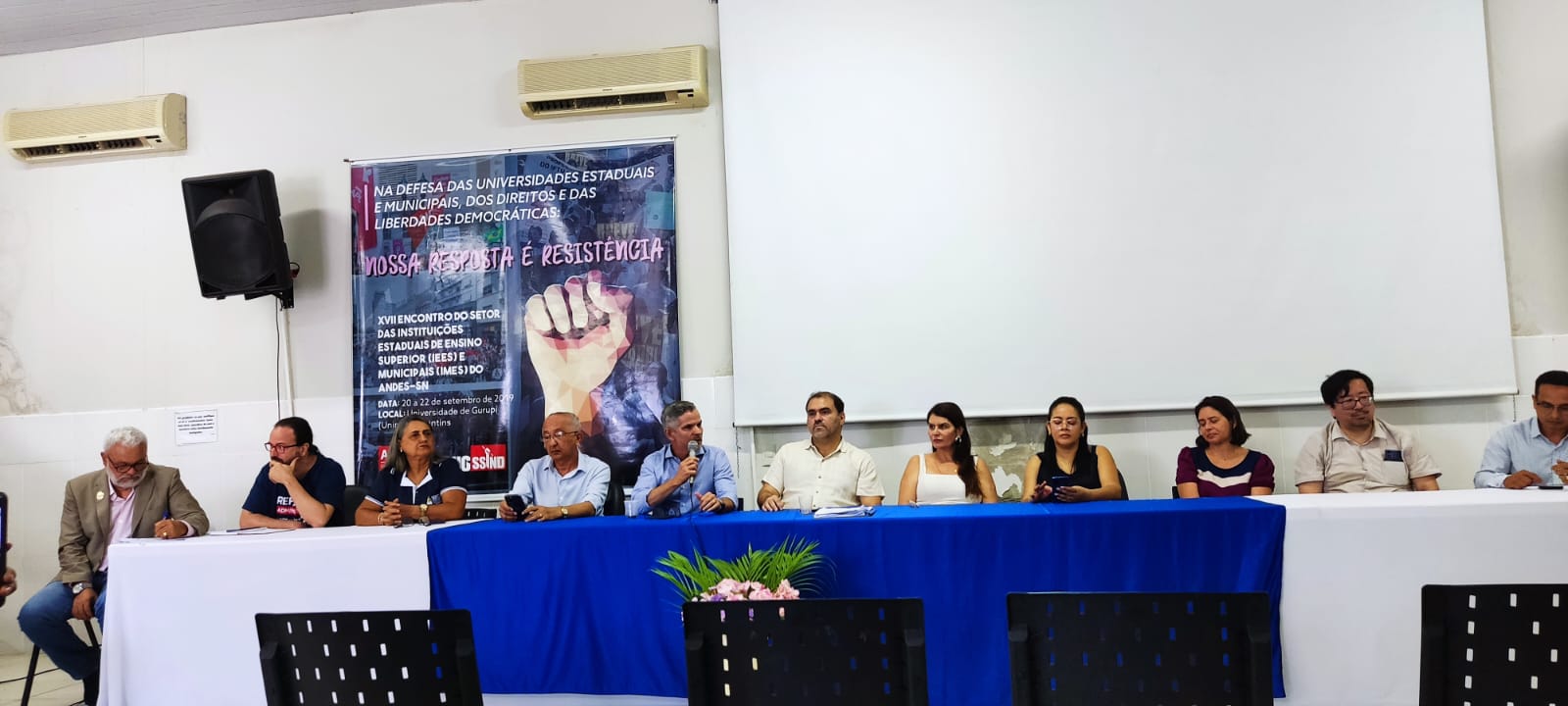Durante a solenidade, compuseram a mesa representantes institucionais e de entidades sindicais parceiras que prestigiaram o momento de transição da gestão. Estiveram presentes a reitora da Universidade UnirG, professora Dr. Jaqueline de Kássia Ribeiro de Paiva; a presidente do SISEMG, Lucileia Barbosa do Nascimento; a representante do SINTET – Regional Gurupi, professora Vanda Paes França; o representante da SESDUFT – Seção Sindical dos Docentes da UFT, professor Fabiano Kenji Nohama; o presidente da ASAUNIRG, vereador Walter Coelho; além do professor Márcio Bernardes de Carvalho, que participou representando a Diretoria Nacional do ANDES-SN pela Regional Planalto. O presidente da Fundação UnirG Thiago Miranda foi representado pela Diretora Financeira Maria Adriana. Também estiveram presentes o Vice- Prefeito de Gurupi Adailton Fonseca e o Secretário de Governo Zezinho da Lá fiche, representando a Prefeita Josi Nunes.