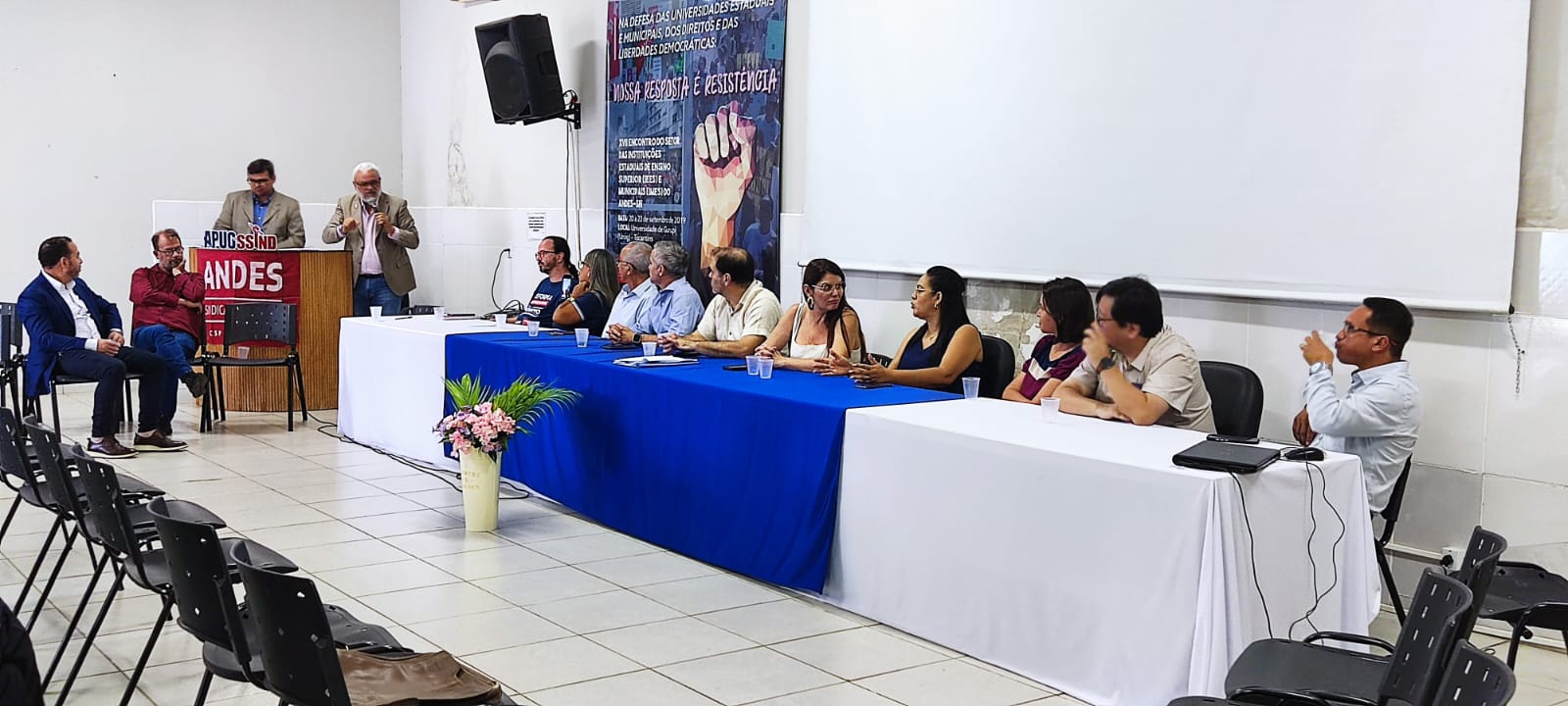 Houve um momento de fala para todos os integrantes da mesa, e os representantes das entidades sindicais agradeceram a APUG por todo esforço e por todas as lutas conjuntas e pela coletividade que há entre os sindicatos em prol dos direitos sejam eles docentes ou não.   O representante do ANDES-SN – Regional Planalto, professor Márcio Bernardes de Carvalho também fez uso da palavra e falou sobre a importância da APUG,  e fez um breve resumo sobre a reforma trabalhista, e o que está por vir, falou ainda e ressaltou que quando a Apug esta mobilizada, o Andes- SN também esta mobilizado, pois juntos fortalecem ainda mais a luta, e formam um só lutando pelo direito docente. Ele parabenizou ainda a gestão do Professor Antonio Jeronimo Netto e a gestão eleita e empossada do Professor Gilberto Correia e demais membros da nova diretoria.