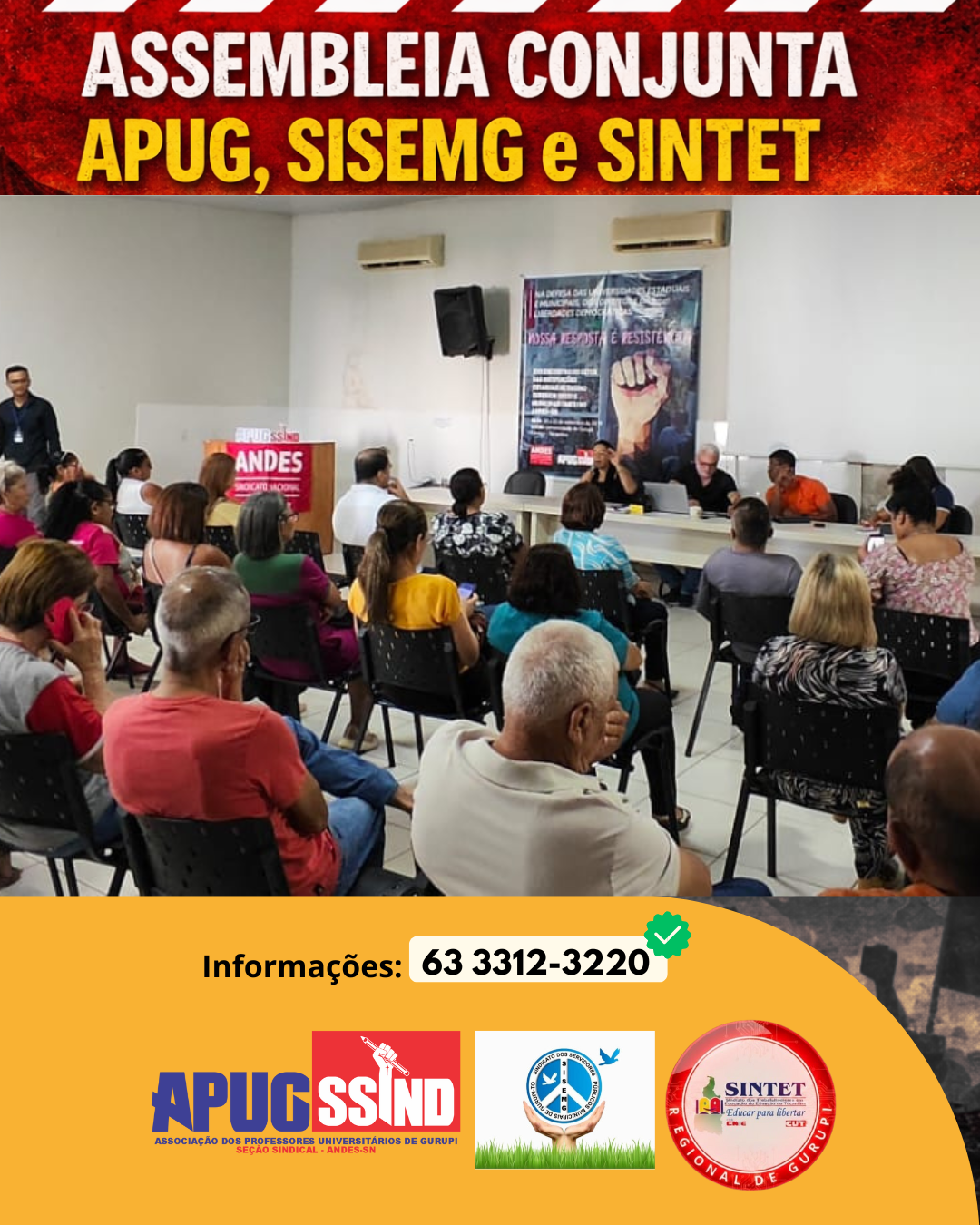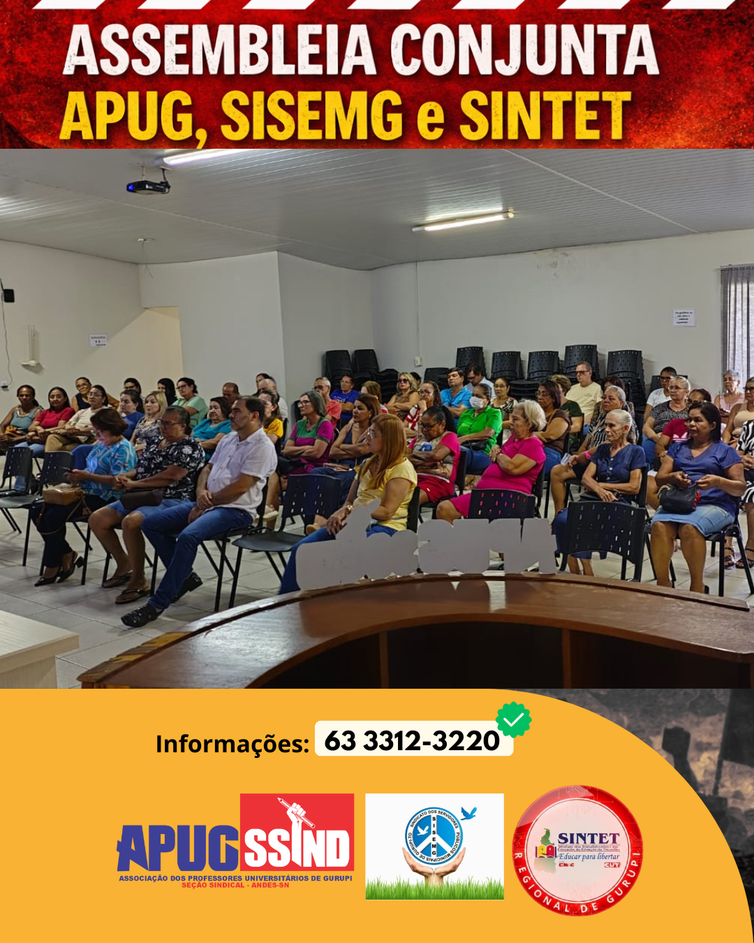 Ontem, no Auditório Laudete Aires, ás 17h, realizamos nossa Assembleia Conjunta, Apug Ssind, Sisemg e Sintet. Foi um importante momento de diálogo, escuta e construção coletiva. A participação dos presentes fortaleceu o debate, reafirmou compromissos e contribuiu para decisões relevantes em prol da categoria. Juntos e avante sempre!
